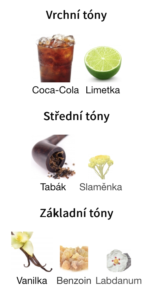 Typ vůně: | Hřejivě pikantní, Vanilková, Pudrová, Nasládlá, Tabáková, Coca-Cola |
