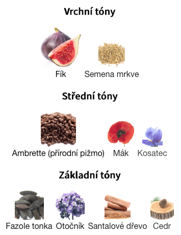 Typ vůně: | Ovocná, Dřevitá, Pižmová, Pudrová, Květinová |