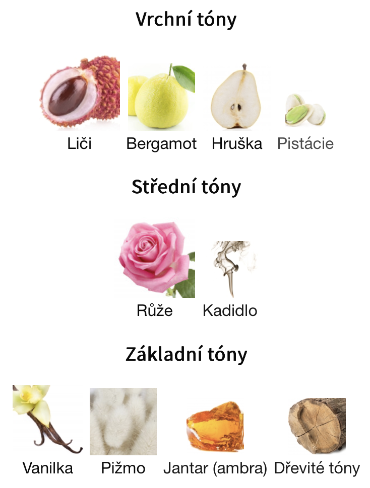 Typ vůně: | Ovocná, Jantarová, Vanilková, Pižmová, Pudrová, Růže |