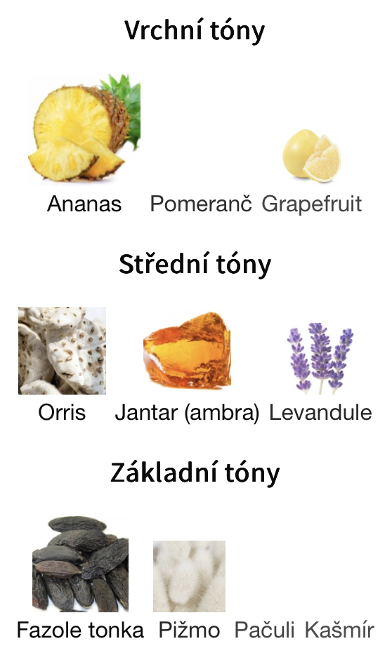 Typ vůně: | Ovocná, Jantarová, Pudrová, Nasládlá, Tropická |